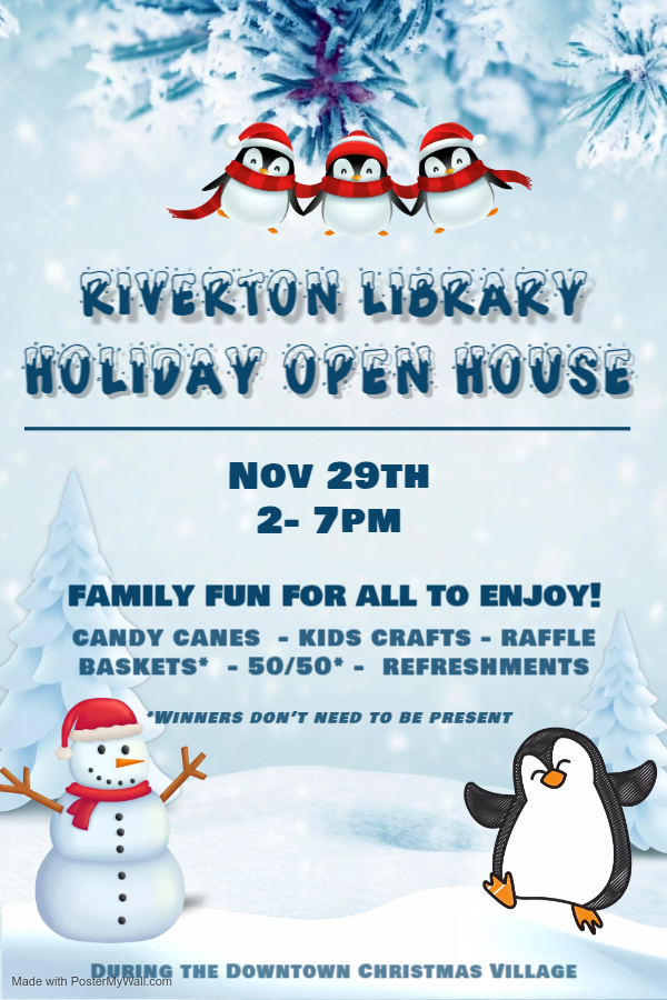 2025 Holiday Open House Published November 14, 2025 at 600 × 900 in Riverton Library Open House Share this: Click to share on Facebook (Opens in new window) Facebook Click to email a link to a friend (Opens in new window) Email Click to print (Opens in new window) Print